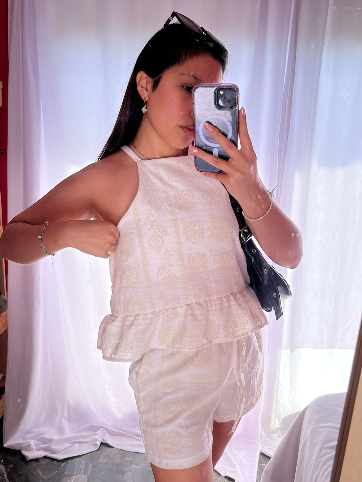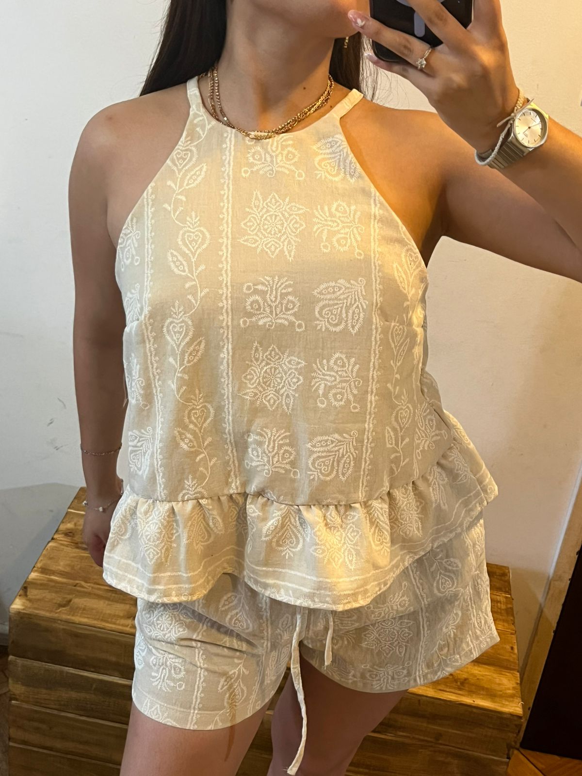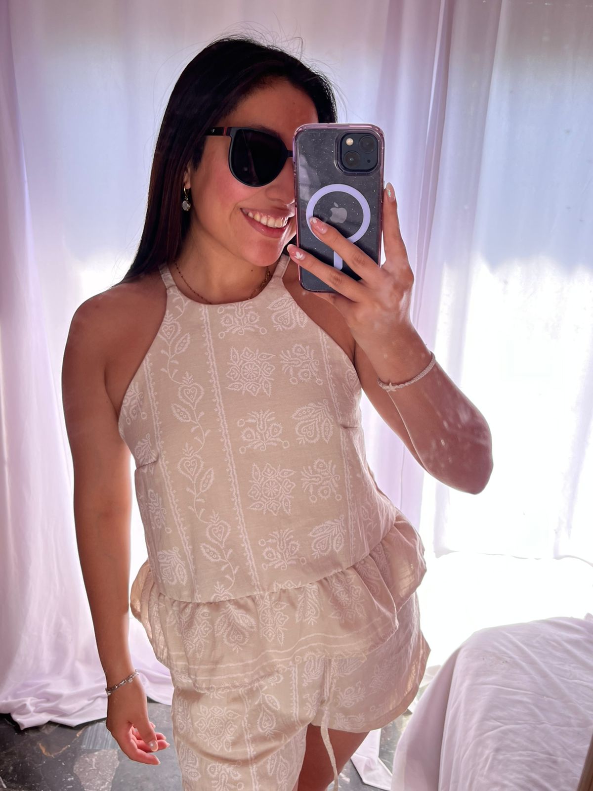 Es de tela lino bordado, recomendable hasta un talle L y 95 de busto