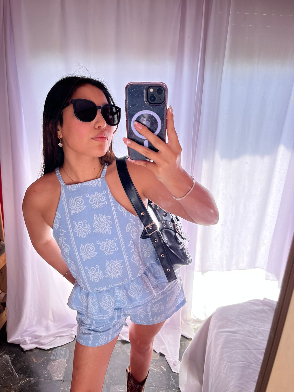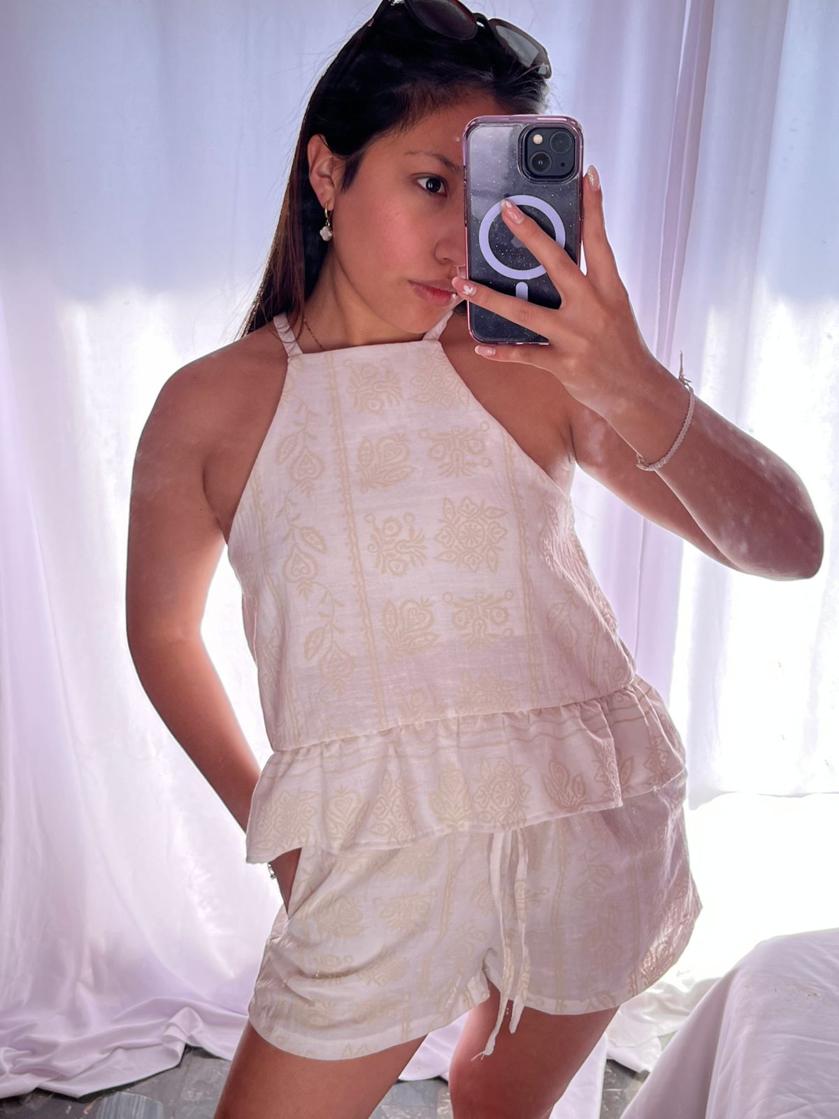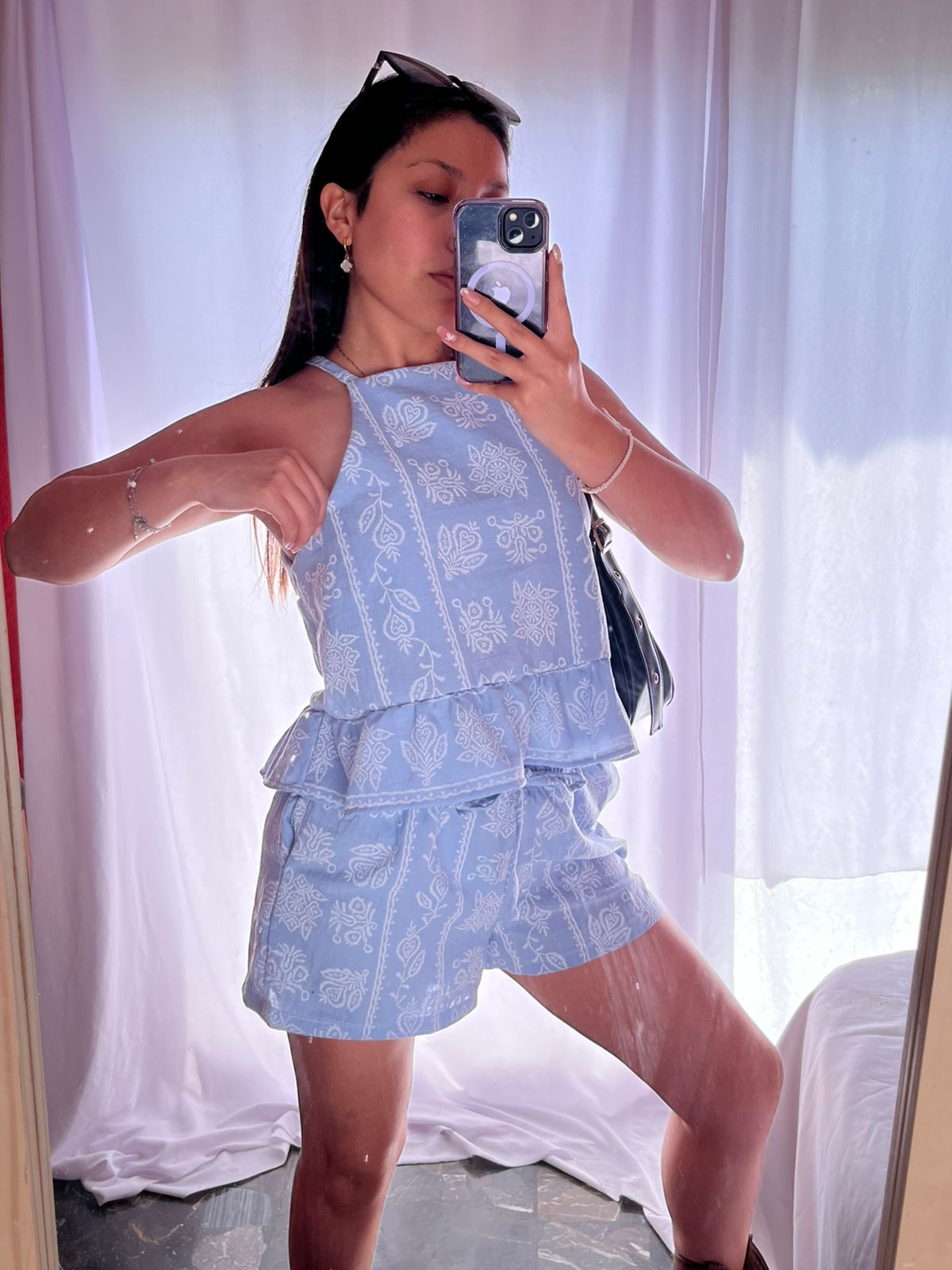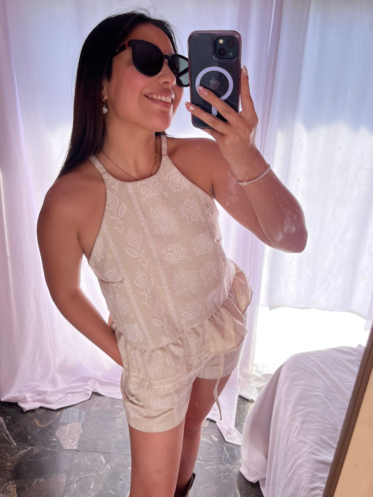 Es de tela lino bordado, recomendable hasta un talle L y 95 de busto